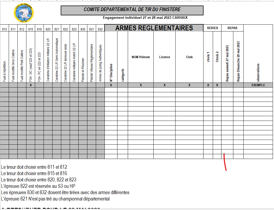 Voici l'invitation et la feuille d'inscription pour le Championnat Départemental Tir aux Armes Réglementaires qui aura lieu à CARHAIX les 27 et 28 MAI 2023.