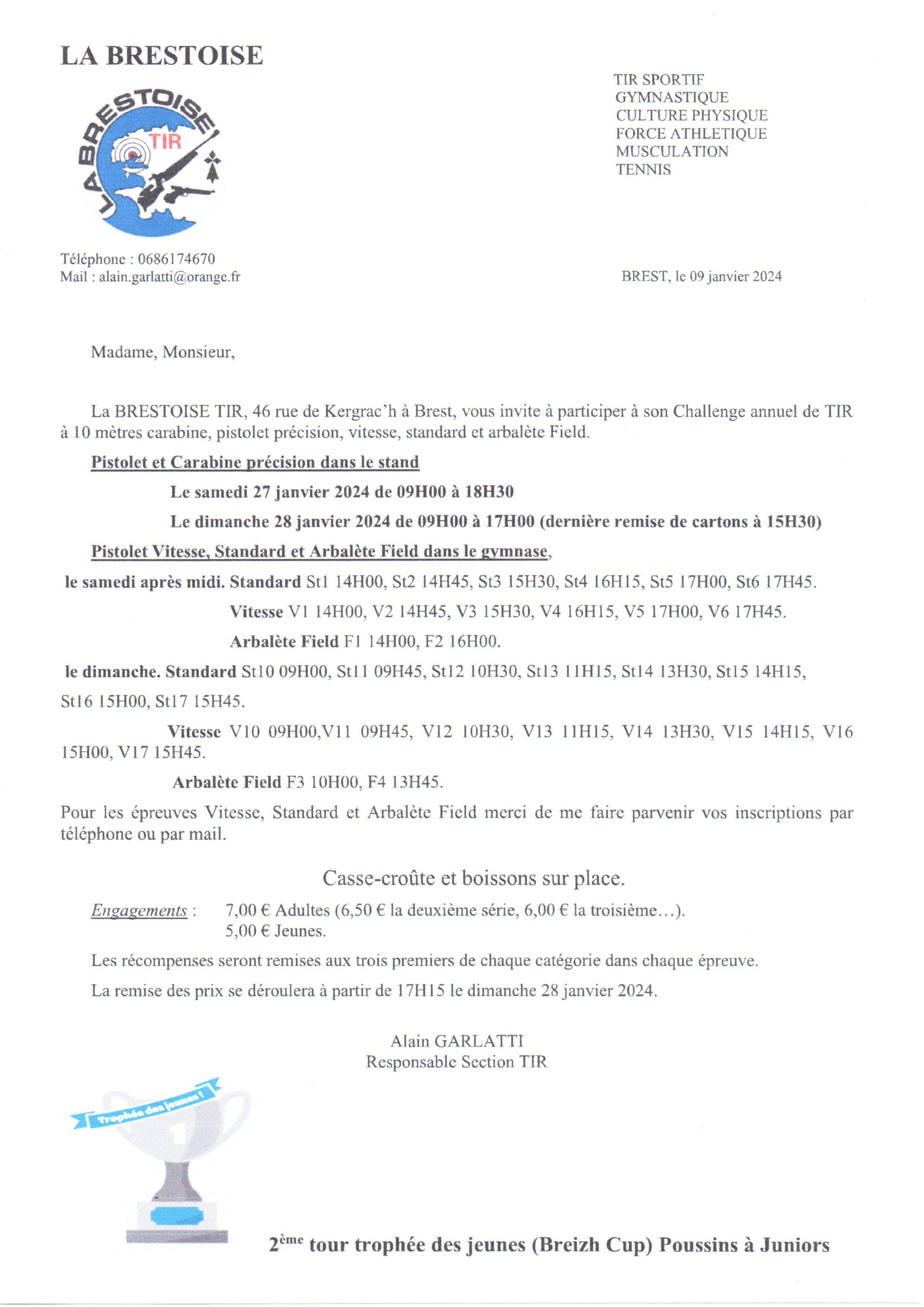 ci joint l'invitation au challenge annuel de la brestoise le 27 et 28 janvier sur leur site au 46 rue de Kergrac'h à Brest.