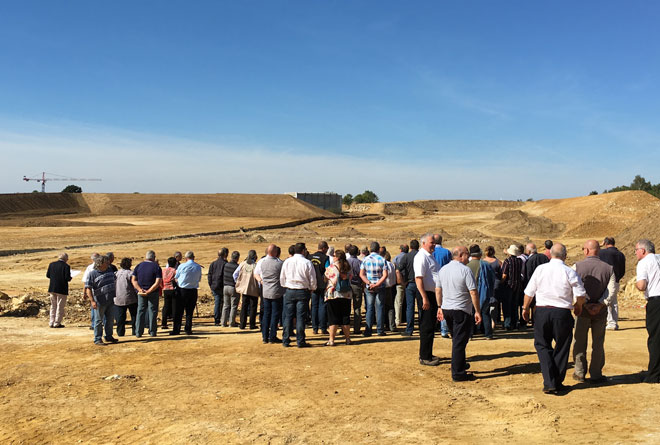 La visite continua avec un arrêt sur le futur stand10/25/50 mètres, dont les murs sont déjà levés et où les premiers pare-balles se mettent en place. Enfin, après un passage devant l'immense anneau constitué par le merlon de 15 mètres de hauteur qui protègera les cinq postes de tir au plateau, la visite se termina par une promenade de découverte des premières alvéoles de Tir Sportif de Vitesse.