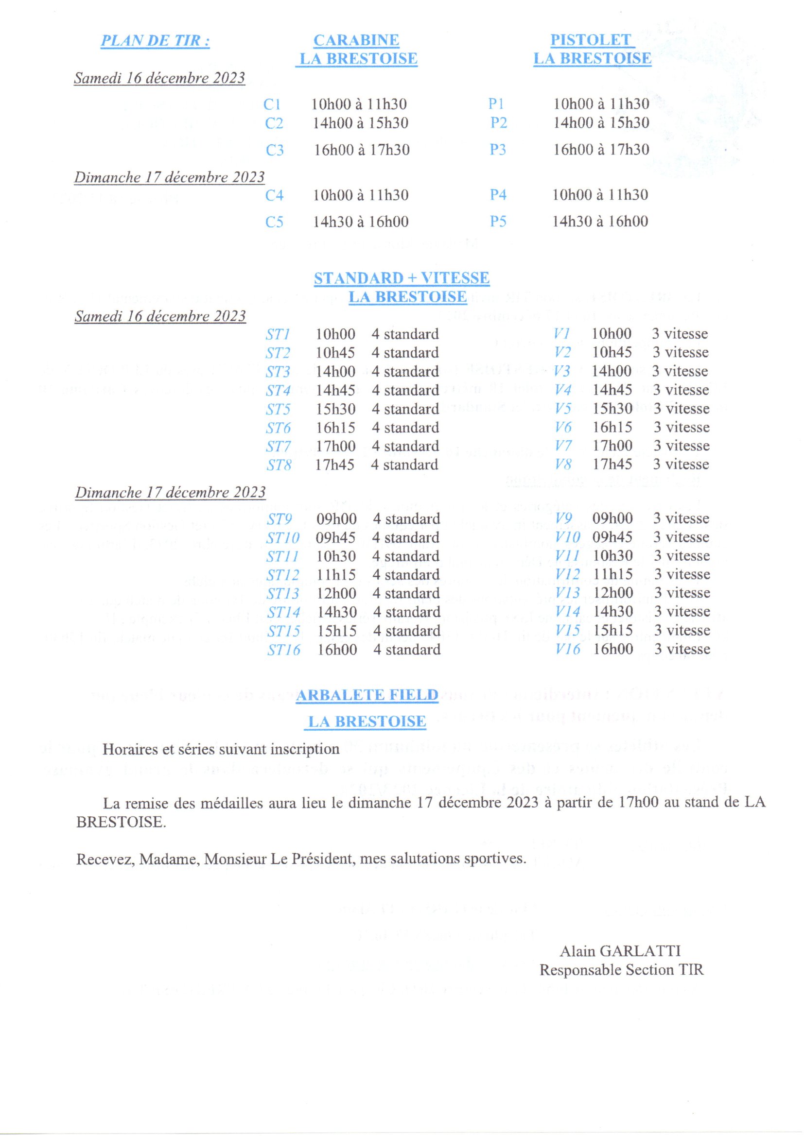 Au-delà du 11 Décembre, prendre contact directement avec Alain Garlatti mais vous devrez payer vos tirs et nous fournir un justificatif.