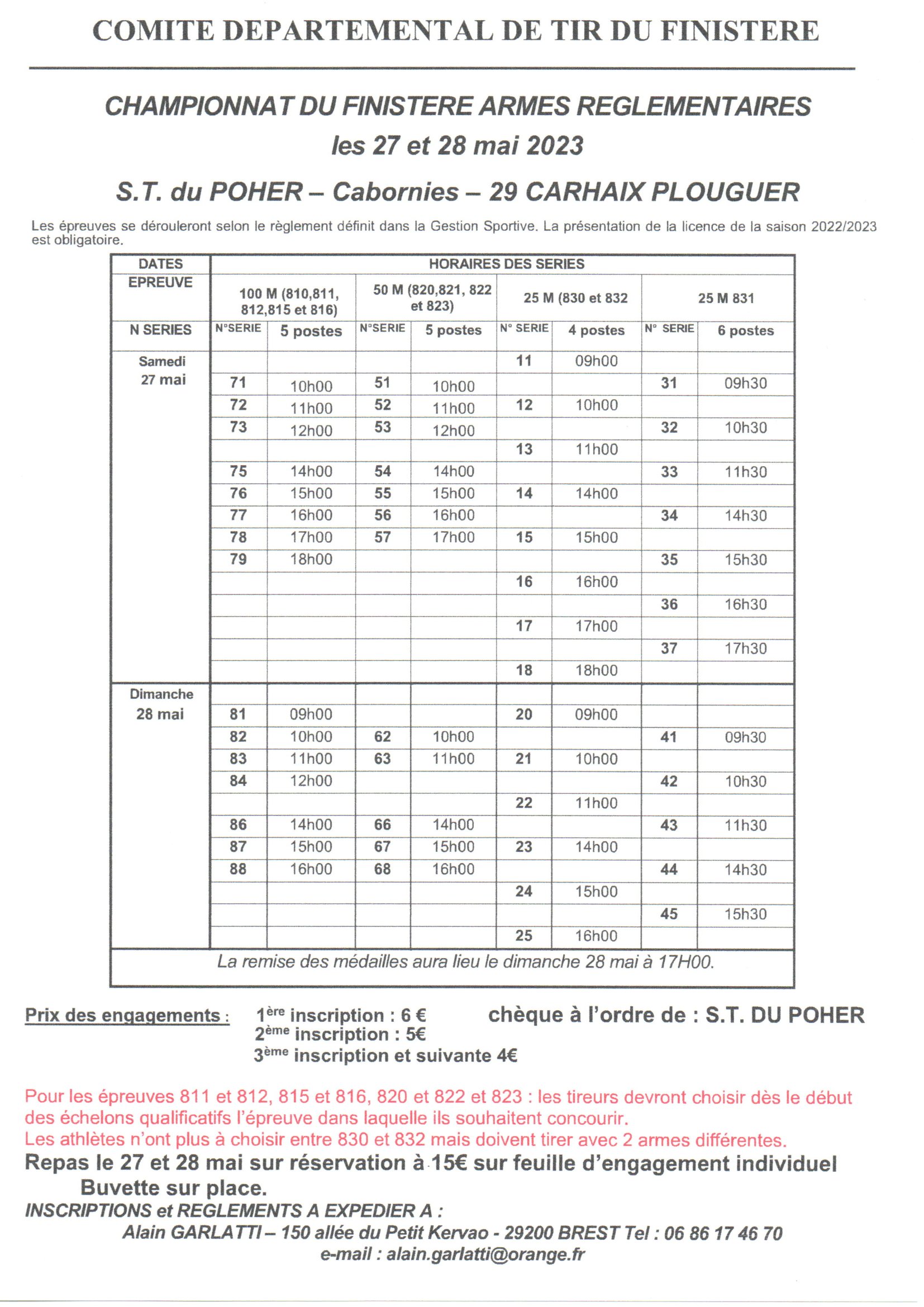 Voici l'invitation et la feuille d'inscription pour le Championnat Départemental Tir aux Armes Réglementaires qui aura lieu à CARHAIX les 27 et 28 MAI 2023.