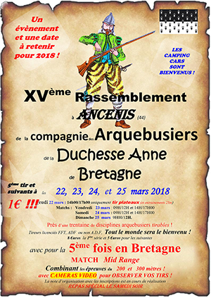 Quinzième rassemblement des arquebusiers de la Duchesse Anne de Bretagne à Ancenis les 22, 23, 24 et 25 mars 2018.